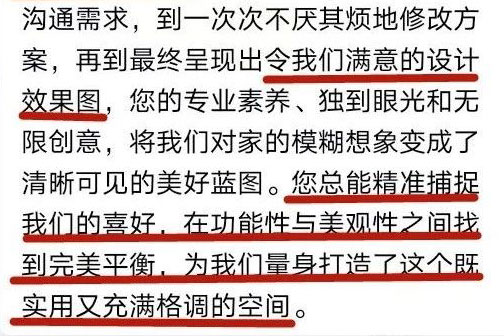 “金杯銀杯不如客戶的口碑”,在裝修界,有一種強大的影響力叫“業(yè)主代言”。南京紅牛裝飾以客戶滿意度作為檢驗家裝質(zhì)量的唯一標準,以口碑鑄就品牌力量。因此,收獲了眾多裝修客戶的認可與贊許。